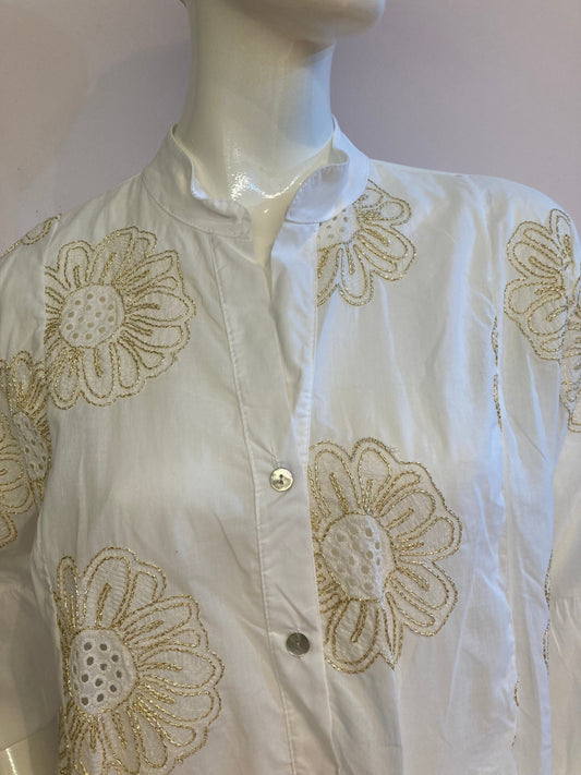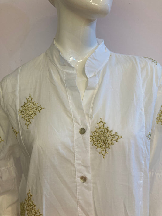White skater dress with gold and colored yoke on the arms and open back