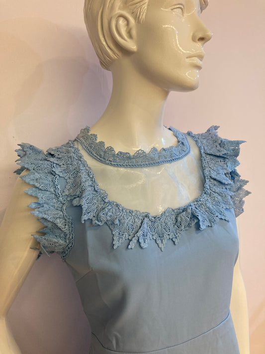 Blue dress with chiffon and lace at bust and collar.