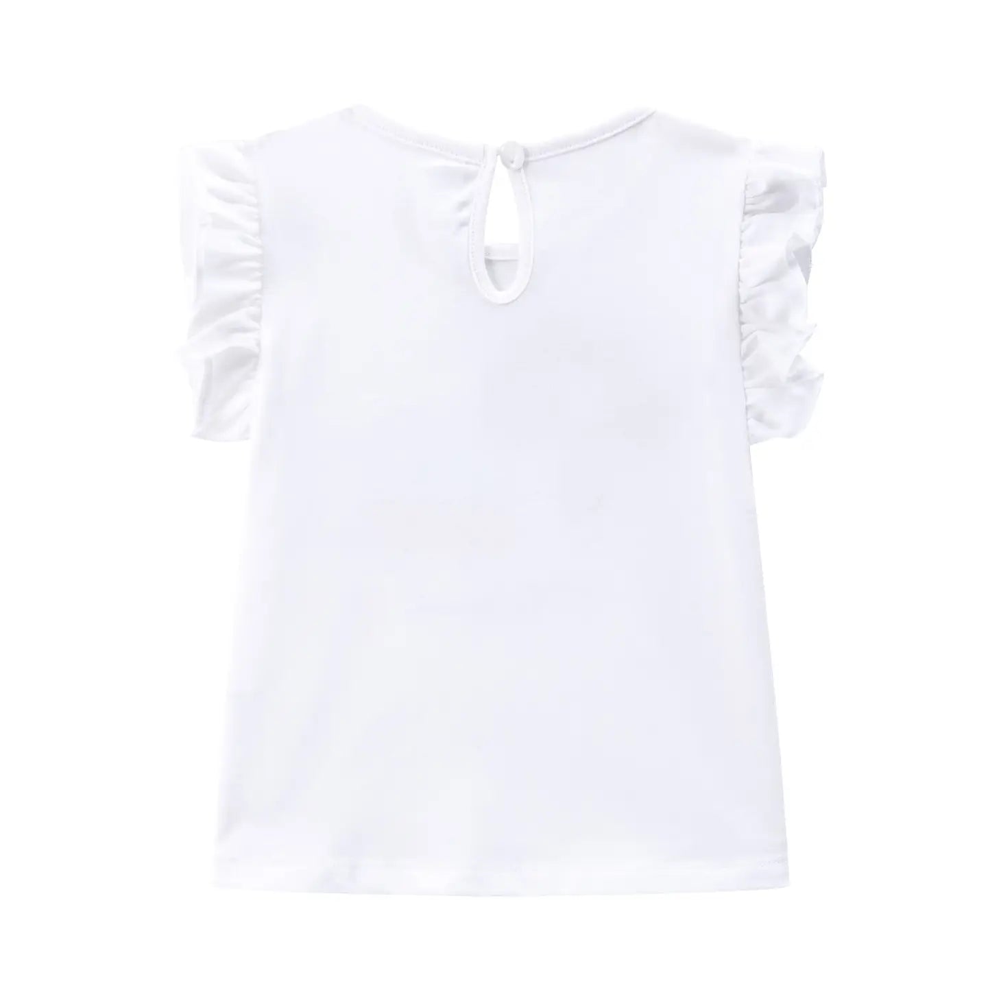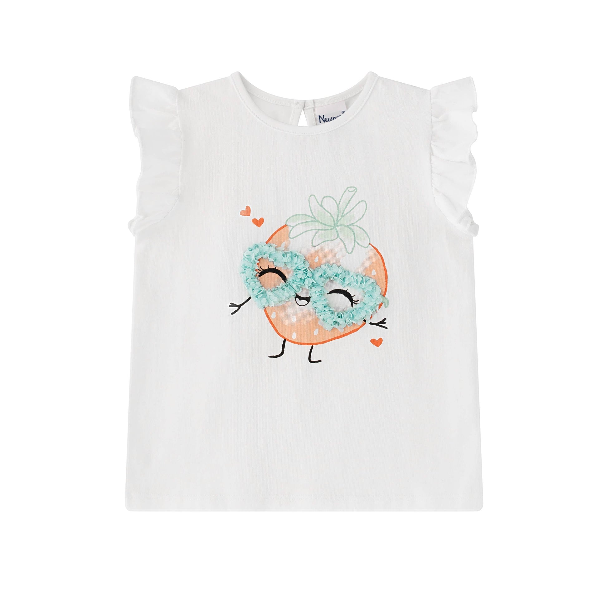 Baby-t-shirt met bril voor aardbeienmeisjes. T-shirt met korte mouwen voor babymeisjes met ruches. Ronde hals Knoopsluiting aan de achterkant. Gemaakt van 95% katoen en 5% elastaan