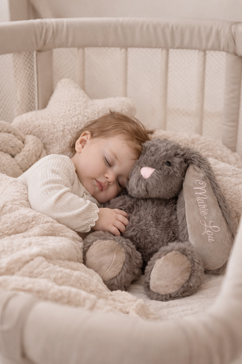 Met naam geborduurd wordt deze Bunny een persoonlijk knuffelvriendje dat je baby overal mee naartoe neemt – van bedje tot buggy 🤎