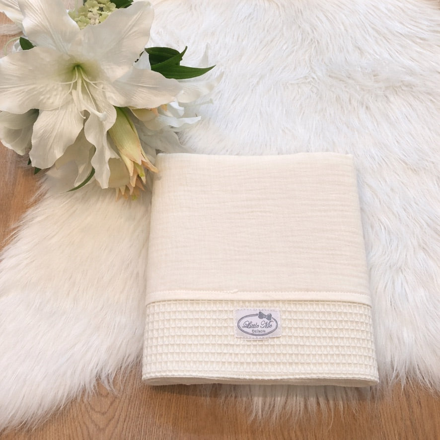 Laat je baby genieten van comfort en frisheid tijdens warmere dagen met dit warm wafel zomerdekentje in vanilla milk. Dit lichte dekentje is gemaakt van ademend katoen met een verfijnde wafelstructuur, waardoor het ideaal is voor lente en zomer.